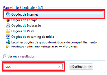 Após concluídas as atualizações reinicie o computador. Agora clique novamente no botão windows e busque por “Opções de Internet”.