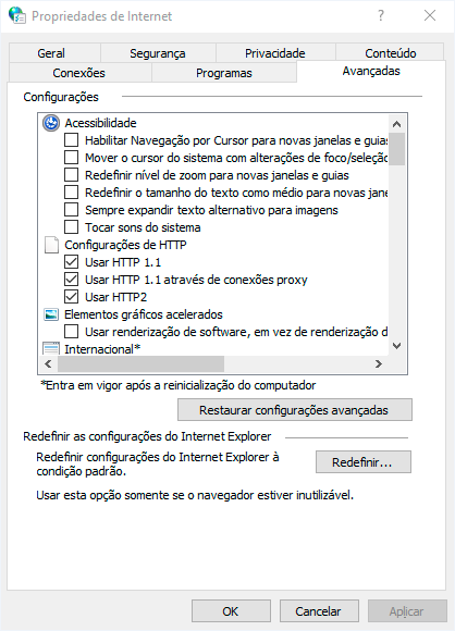 Vá na aba “Avançado” depois clique em “Redefinir”.