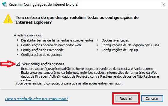 Marque a opção “Excluir Configurações Pessoais” e clique em “Redefinir”, Fique tranquilo, isto não apaga senhas salvas nem dados de navegação!