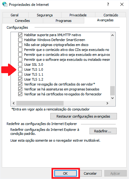 Feche todos os navegadores e abra novamente a Opções de Internet, vá novamente na aba “Avançado”, desça a barra de rolagem até o final, desmarque as opções SSL 3.0, TLS 1.0 e TLS 1.1, deixe apenas selecionado TLS 1.2 e clique em OK.