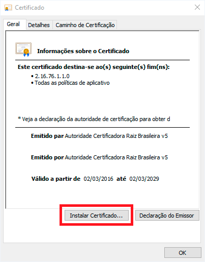 Agora baixe a cadeia V5 clicando aqui. Após, abra o arquivo baixado e clique em "Instalar Certificado".