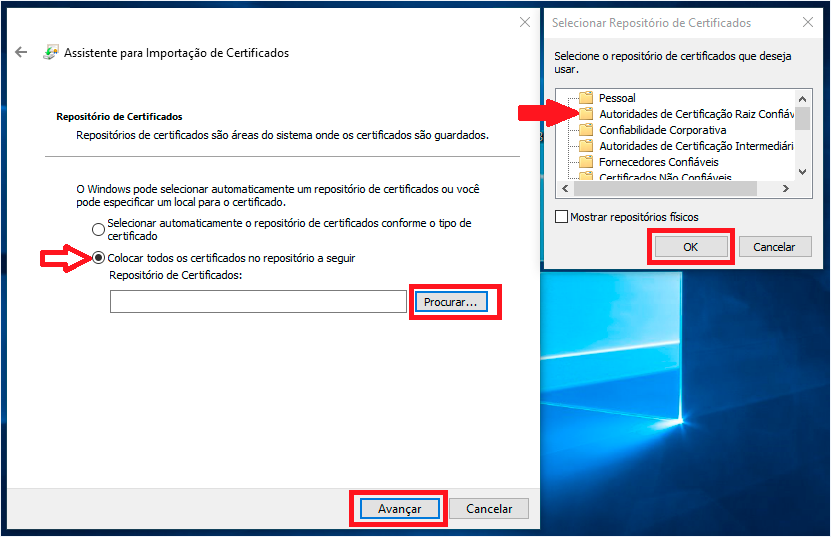 Clique em “Avançar” e selecione “Colocar todos os Certificados no repositório a seguir”, depois clique em Procurar e selecione “Autoridade de Certificação Raiz Confiáveis” clique em OK e em Avançar novamente e por fim clique em OK
